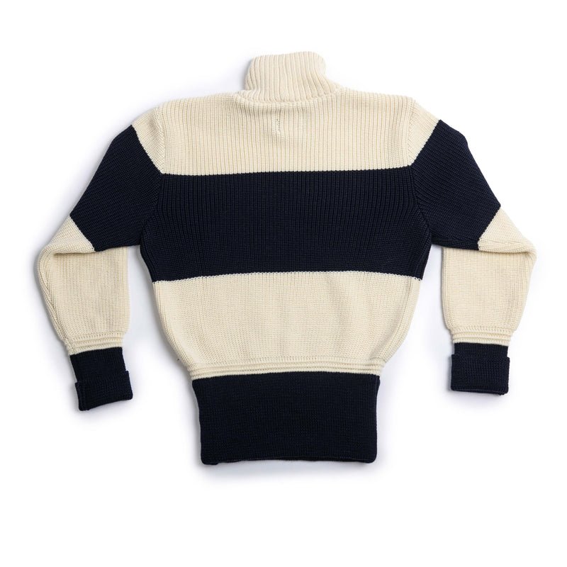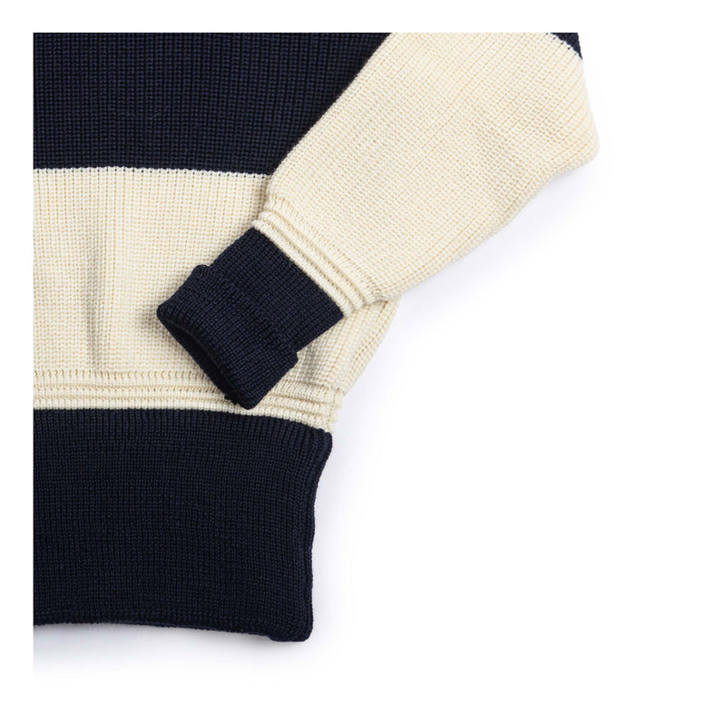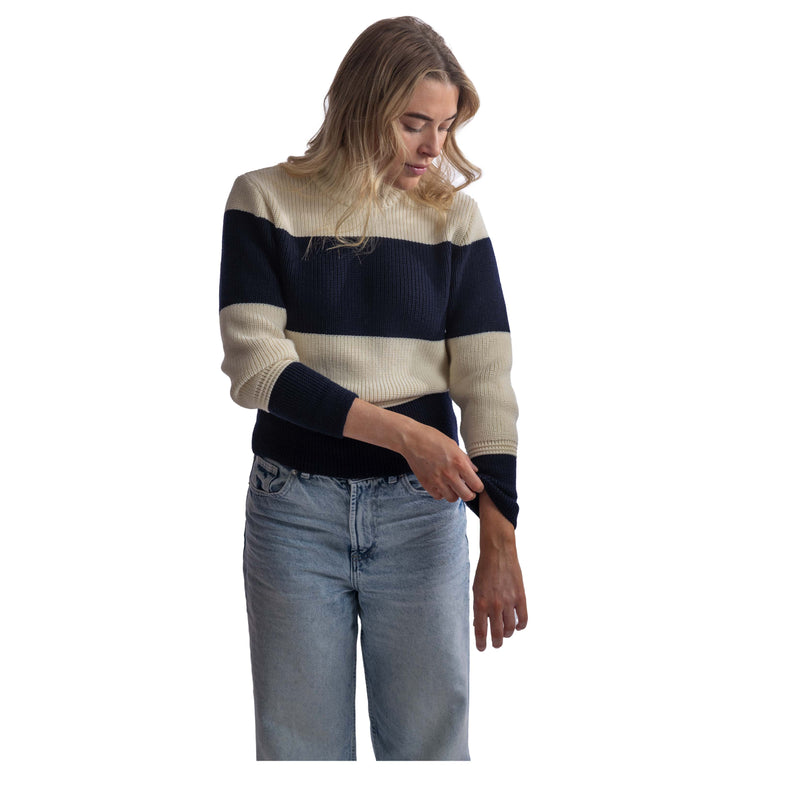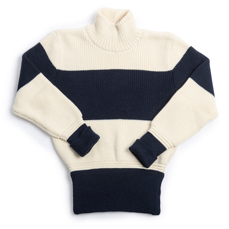 Taking inspiration from our classic Rollkragen and Rundhals it is a natural step to introduce two womenswear-specific sweaters. The exaggerated wide hem and long cuffs signal to WW2 RAF details. Signature stripes on cuffs and hem. The sleeves and collar are attached by hand stitching, proof of individual craftsmanship on every item. Knitted from 5 gauge 100% Extra Fine Virgin Wool.